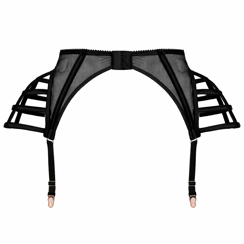 Liguero con estructura liviana tipo bird-cage a los costados forrada en satín. Base en mesh con tiras de liguero removibles y broche trasero